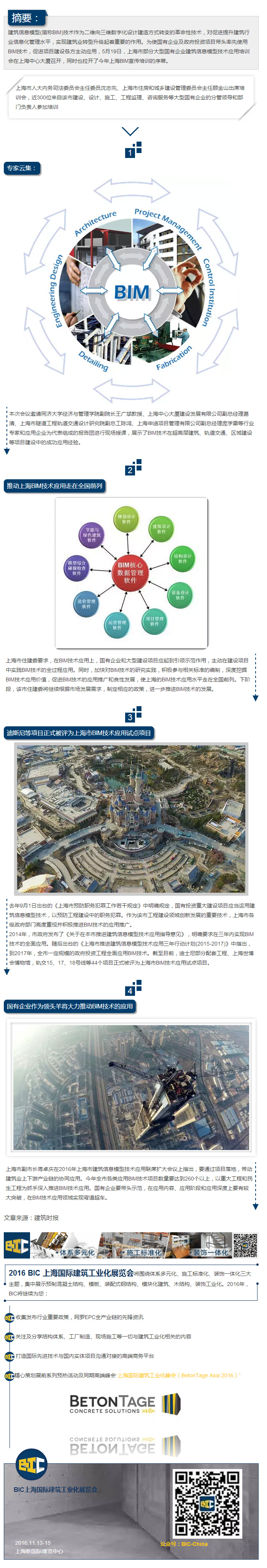 BIC 亞洲國際建筑工業化展覽會 (簡稱:BIC)自2013年舉辦以來,依托上海萬耀企龍展覽有限公司的國際化背景,立足華東、輻射亞太。貫徹“市場主導,政府引導”的基本原則,以“裝配式建筑結構體系、施工裝備和工藝、建造智能化技術”三大核心內容,覆蓋科研、設計、生產加工、施工裝配、運營等建筑全產業鏈。是業內公認的企業展示新技術、新材料、新工藝、新設備的國際性交流洽談及采購貿易平臺。