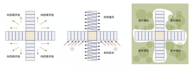 十字單元布局,實(shí)現(xiàn)建筑在視野、通風(fēng)采光和綠化等方面的開放格局