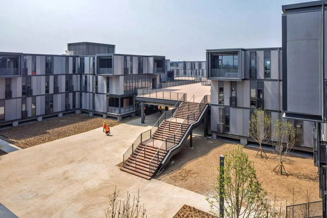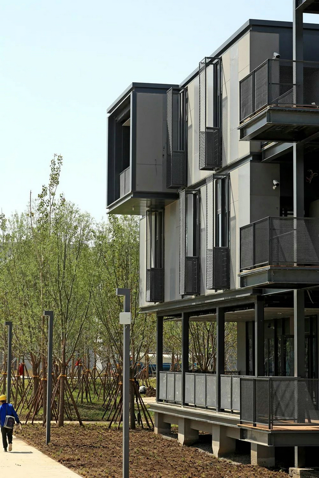 在材料方面,則選取水泥壓力板、金屬網(wǎng)與玻璃作為建筑立面材料,以集裝箱為單位,標(biāo)準(zhǔn)化分隔,便于高效生產(chǎn)與施工。同時(shí),金屬網(wǎng)種植綠色爬藤,以垂直綠化營(yíng)造園區(qū)生態(tài)環(huán)境。