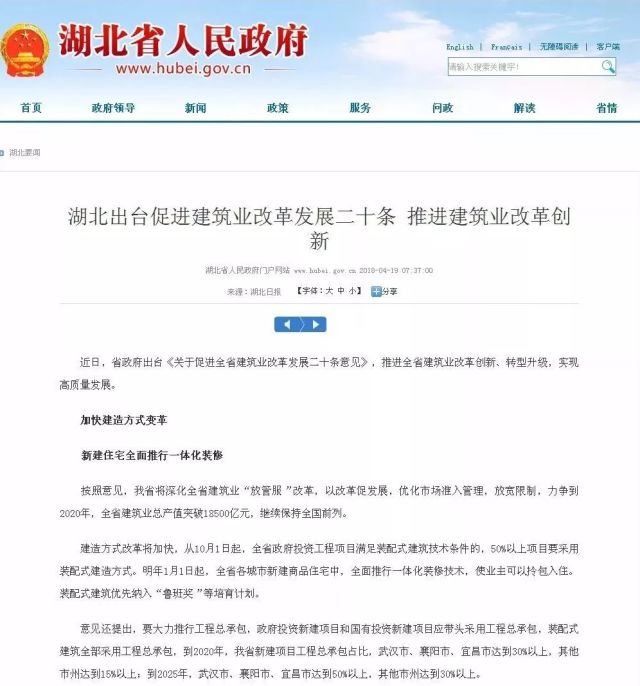 近日湖北省人民政府網公開了《省人民政府關于促進全省建筑業改革發展二十條意見》其中第4點“深化建造方式改革”中明確提出從2018年10月1日起,全省政府投資工程項目滿足裝配式建筑技術條件的,50%以上項目采用裝配式建造方式。2019年1月1日起,全省各城市新建商品住宅中,全面推行一體化裝修技術。