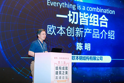 在“第八屆結構成就建筑之美高峰論壇”上,歐本董事長陳明先生以“一切皆組合”為主題進行演講。陳明先生在演講中介紹了歐本的創新之路,從“引進國外產品”到“自主研發創新”,在結構創新道路不斷探索,領悟到幾乎所有創新都是在已有技術的基礎上的重新組合升級,新的組合就是創新。基于這樣的理念,推出了甲殼柱、甲殼梁、優腹梁、優肋板等自主研發產品,通過對已有產品的創新組合,有效解決了傳統建造方式的弊端,并且編制了相關行業標準:《波紋鋼板組合框架結構技術規程》,《優肋免拆模組合樓板圖集》。