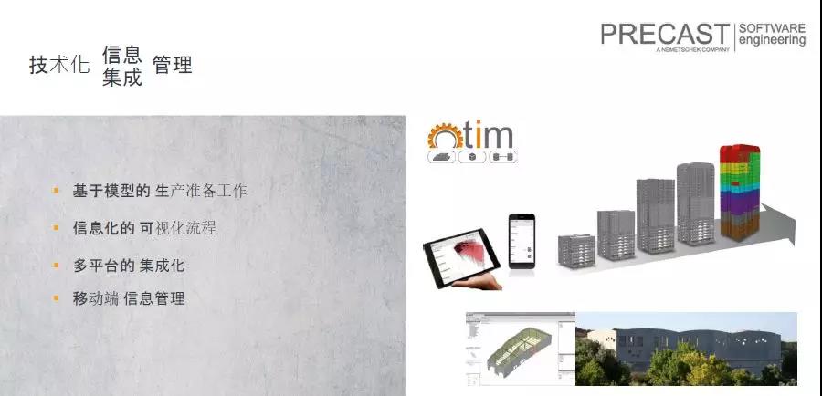 歐洲考察最后一站是歐洲最大的建筑設(shè)計軟件供應(yīng)商——內(nèi)梅切克集團(tuán)公司,預(yù)制領(lǐng)域的主打軟件是Planbar和Tim,其核心理念是打破了BIM只在建筑設(shè)計階段數(shù)據(jù)共享(如我們所說的正向設(shè)計),建立可以讓構(gòu)件生產(chǎn)和建造共享的BIM數(shù)據(jù)平臺,從而為建筑生產(chǎn)設(shè)備,施工質(zhì)量控制等建筑產(chǎn)業(yè)的信息化提供了開放的平臺,是我國推進(jìn)“兩化”融合的現(xiàn)實(shí)版。兩化融合是信息化和工業(yè)化的高層次的深度結(jié)合,是指以信息化帶動工業(yè)化,以工業(yè)化促進(jìn)信息化,走新型工業(yè)化道路。兩化融合的核心是信息化支撐,追求可持續(xù)發(fā)展模式。