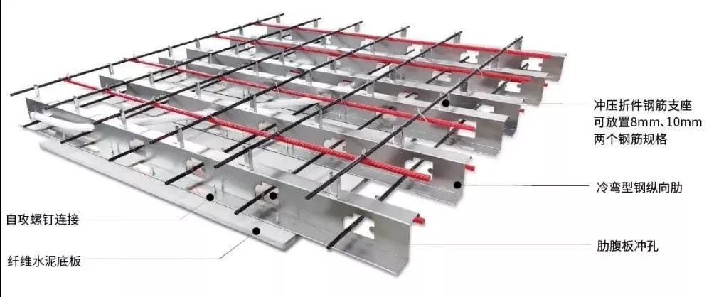 優肋板是歐本研發的新型疊合樓層板,采用冷彎薄壁型鋼加工成肋、通過螺釘與底部的纖維水泥板結合;肋上連續沖孔,板內可以穿鋼筋和管線;纖維水泥底板在澆筑混凝土時作為模板,只需少量支撐即可,完成后無需拆除,對結構來說是保護層,對建筑來說是裝飾層。其構造簡潔易于施工,非常符合裝配式建筑發展的要求,在成本控制、工廠生產及現場安裝節點處理上都具有明顯優勢,具有廣闊的市場潛力。