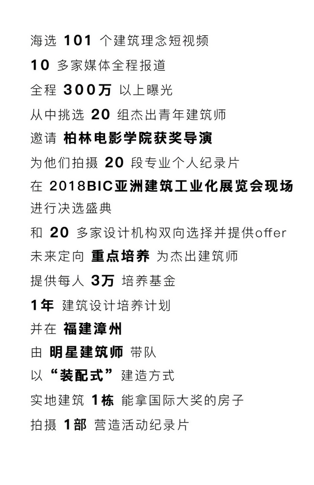 為了能讓更多有獨特思想的建筑師的建筑夢絢爛綻放,這一次 “BIC亞洲國際建筑工業化展覽會”和“建筑學院”攜手,將在全國尋找有獨特建筑夢的青年建筑師,用一年時間傾心培養,以跟隨大咖實戰模式,并設計制作贏取國際大獎的作品,為企業打造國際級的未來建筑師。