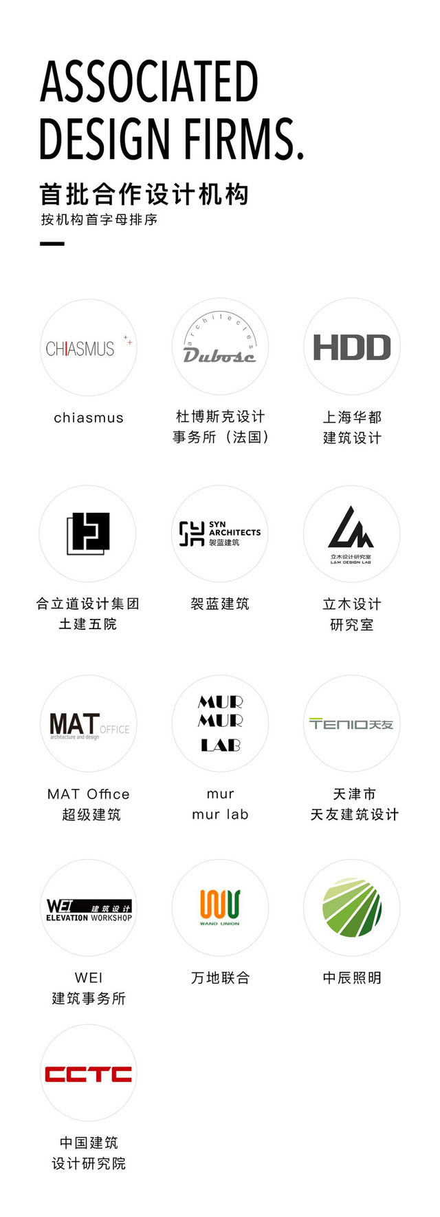 chiasmus、杜博斯克設計事務所(法國)、HDD(上海華都建筑設計)、合立道設計集團土建五院、袈藍建筑、立木設計、MAT Office 超級建筑、mur mur lab、天津市天友建筑設計股份有限公司、WEI建筑事務所、萬地聯合、中辰遠瞻、中國建筑設計研究院有限公司