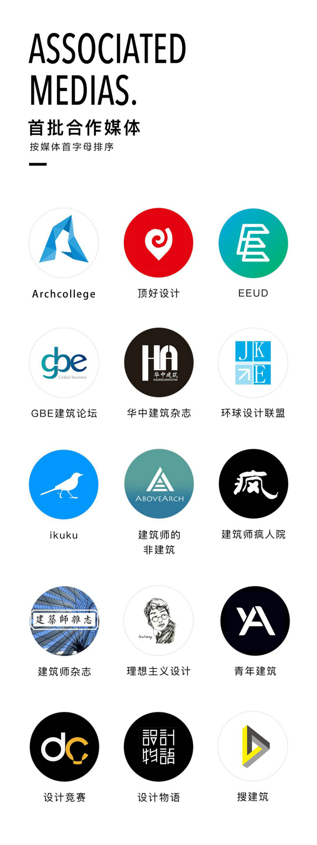 BIC、頂好設計、EEUD、GBE建筑論壇、華中建筑雜志、環球設計聯盟、ikuku、建筑師雜志、建筑師的非建筑、建筑師瘋人院、理想主義設計、青年建筑、搜建筑、設計競賽、設計物語